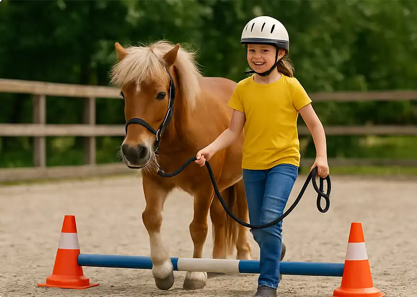 Praxisbeispiel vom Hof: Ein Kind war sehr impulsiv. Es wollte plötzlich hinter dem Pony herlaufen und an den Schweif fassen. Wir haben sofort gestoppt, das Pony in Ruhe gehalten und dem Kind erklärt, warum das nicht geht. Danach haben wir eine kleine Übung gemacht: Hände an die Schulter, einmal tief atmen, dann gemeinsam an der Seite gehen. Das war anstrengend, aber es hat funktioniert. Beim nächsten Mal hat das Kind von sich aus Abstand gehalten.